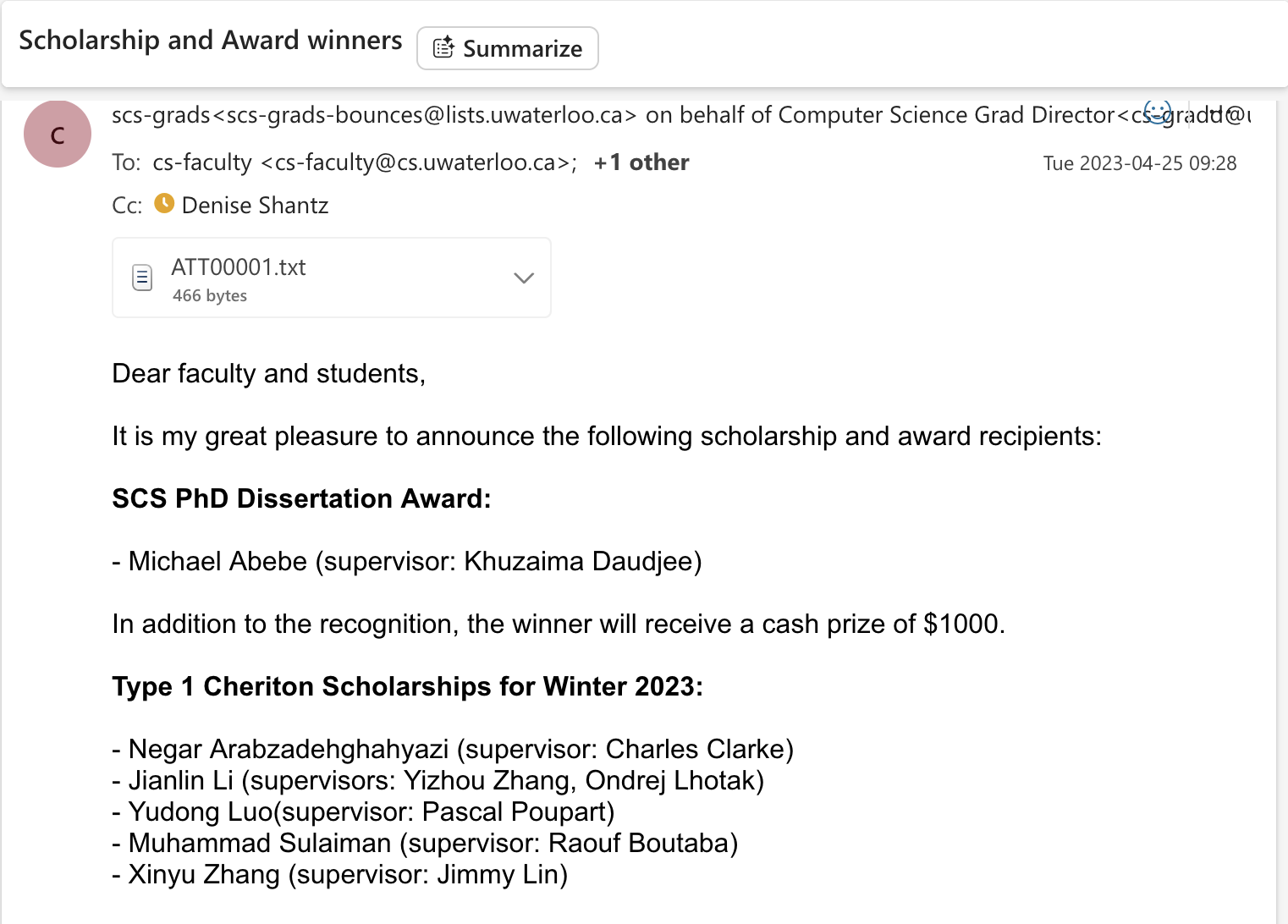 - David R. Cheriton Graduate Scholarship, by School of CS, UWaterloo [Link] (23, 24)